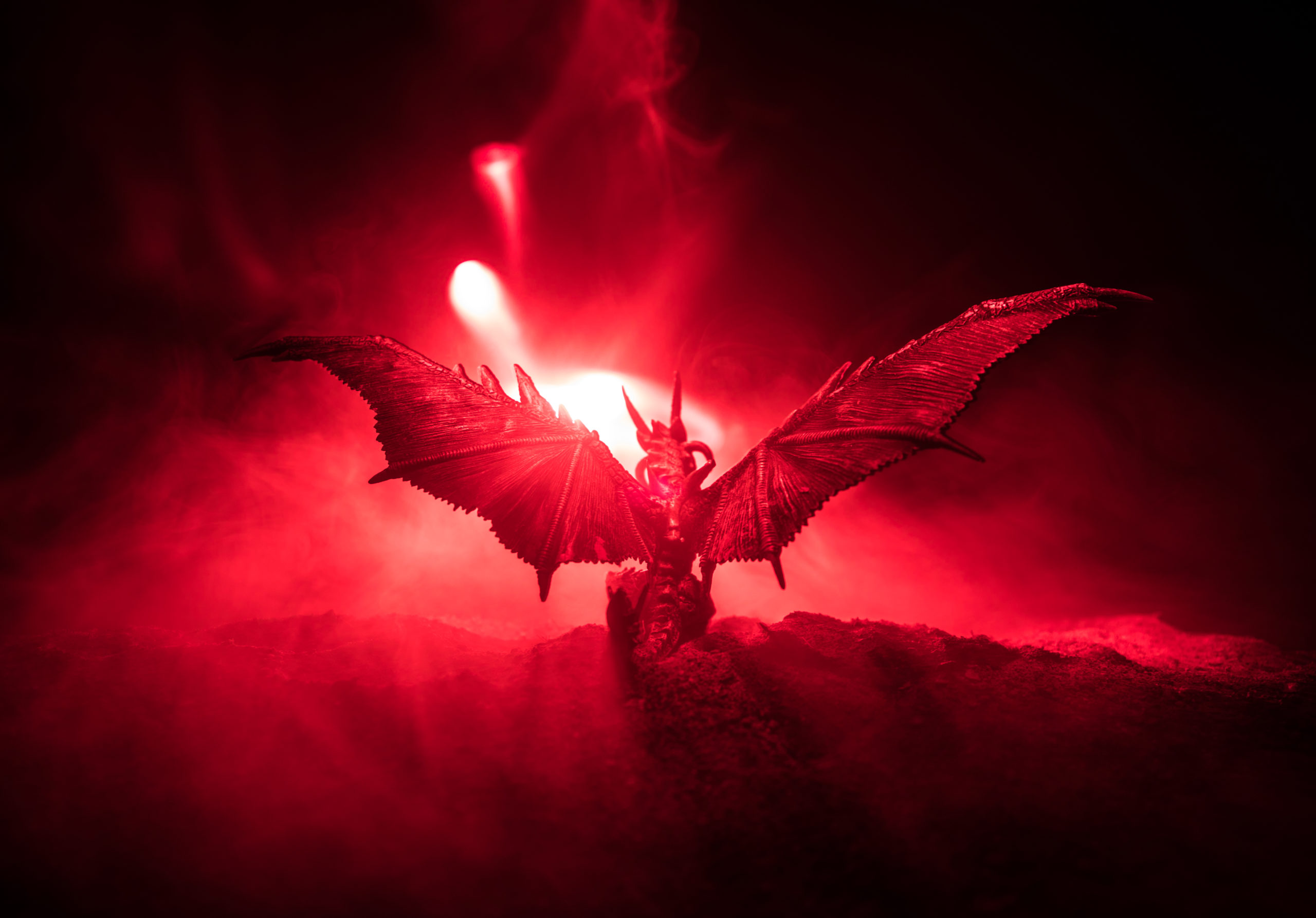 Silhouette of fire breathing dragon with big wings on a dark orange background